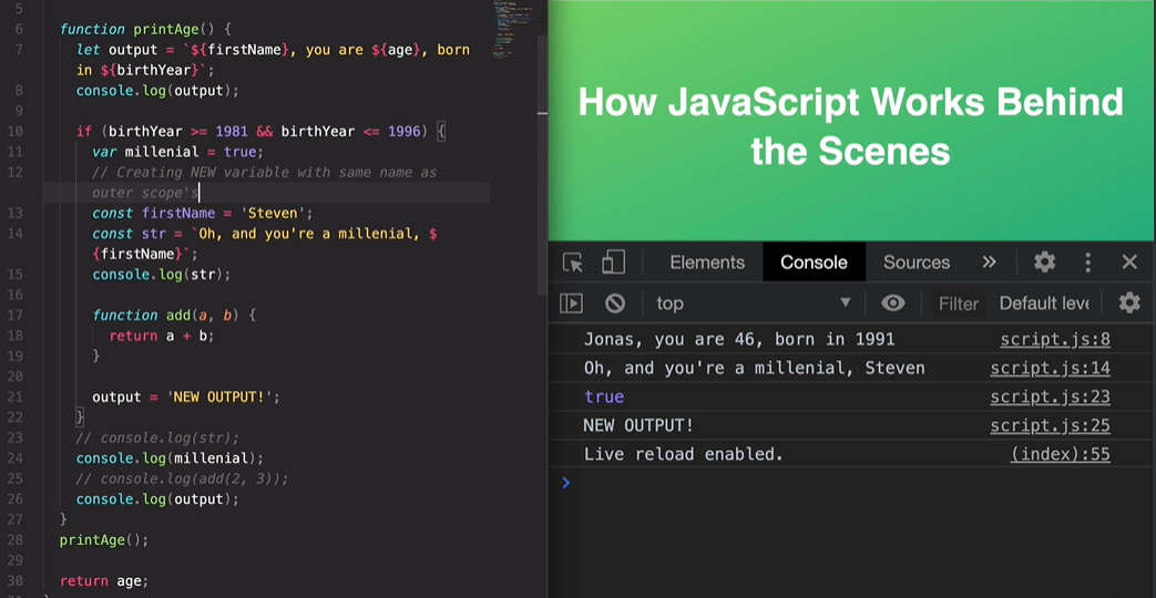 However in line 14, firstName is declared as Steven so it retrieves the value Steven instead of going up the scope chain for Jonas.
