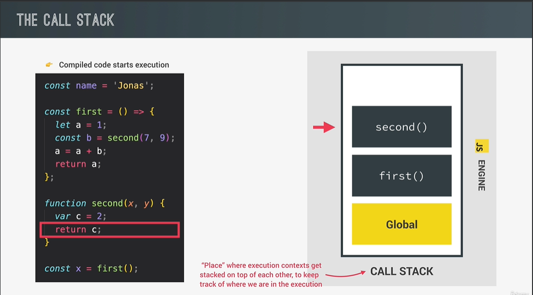 call stack: where our code is actually executed using something called execution contexts
