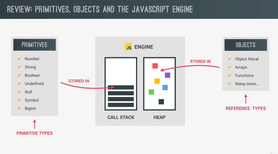 - Primitive values: when entering the call stack, each value gets assigned an identifier, address and value.