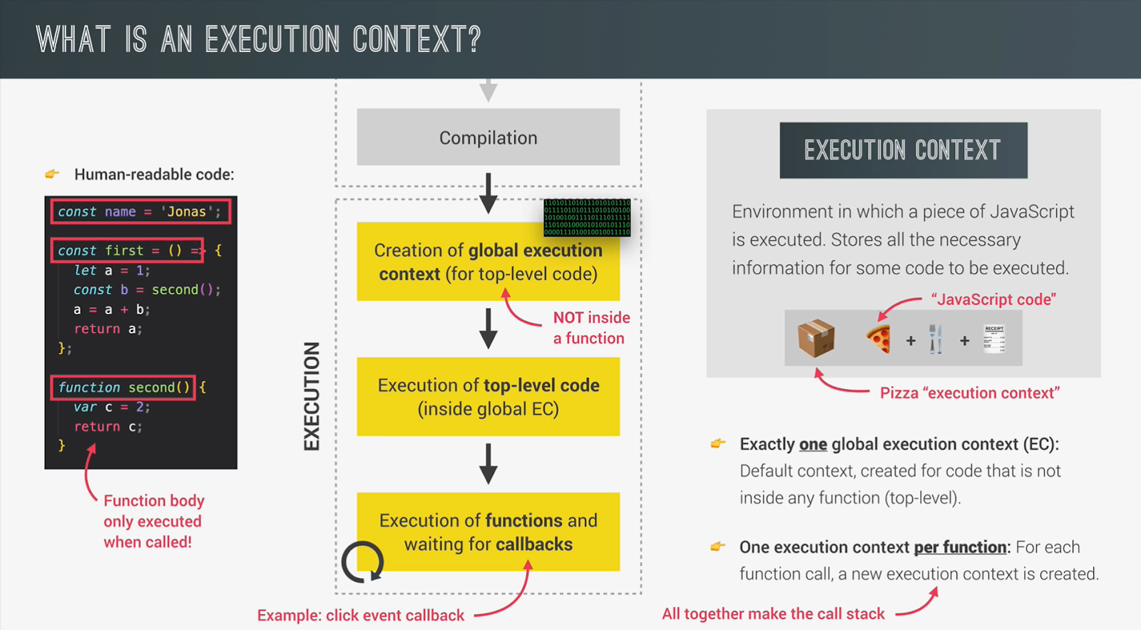Execution Context: an environment in which a piece of JavaScript is executed => box that stores all the necessary information for code to be executed (variables and arguments)